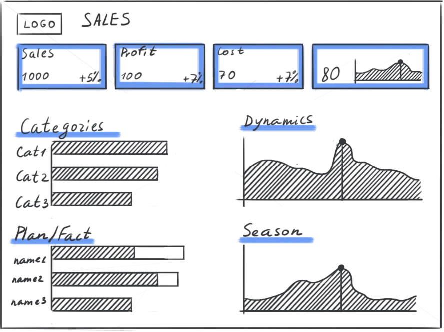 Start with this thought, moving from the general to the particular and identifying the most immediate problems. A dashboard that solves insignificant or highly specific tasks is a dumb one. Using such a tool is like using a workout machine to build up one arm in the hopes of buffing up the whole body. Sounds absurd, doesn’t it? Alas, this approach is very common. If you want to make the most of your dashboard, keep the essentials front and center in your mind. This way you’ll make sure to remember all the important features without being distracted by the secondary ones, losing yourself in the details, and building up one arm.
