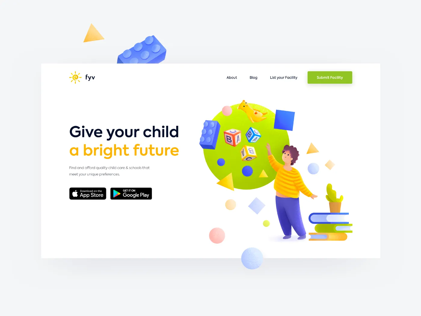 All web design tools are meant to evoke particular emotions. Green, for example, is associated with young plants, growth and development, life and hope. Blue represents peace and tranquility, yellow means sunshine and light. The animation utilizes gravity contrast: a child firmly standing on his feet is juxtaposed with toys floating in weightlessness. This also works to create a sense of stability. Taken together, it induces a calmly optimistic mood and makes people trustful of further information.