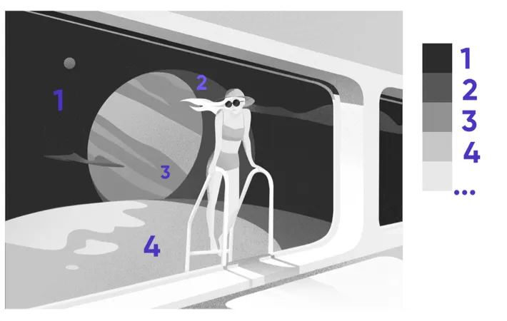 Beginners can simply number the tones from darkest to lightest. It’s important for the elements of a monochrome illustration to have different tones. This will make the same image more harmonious and contrasting when it’s colored.