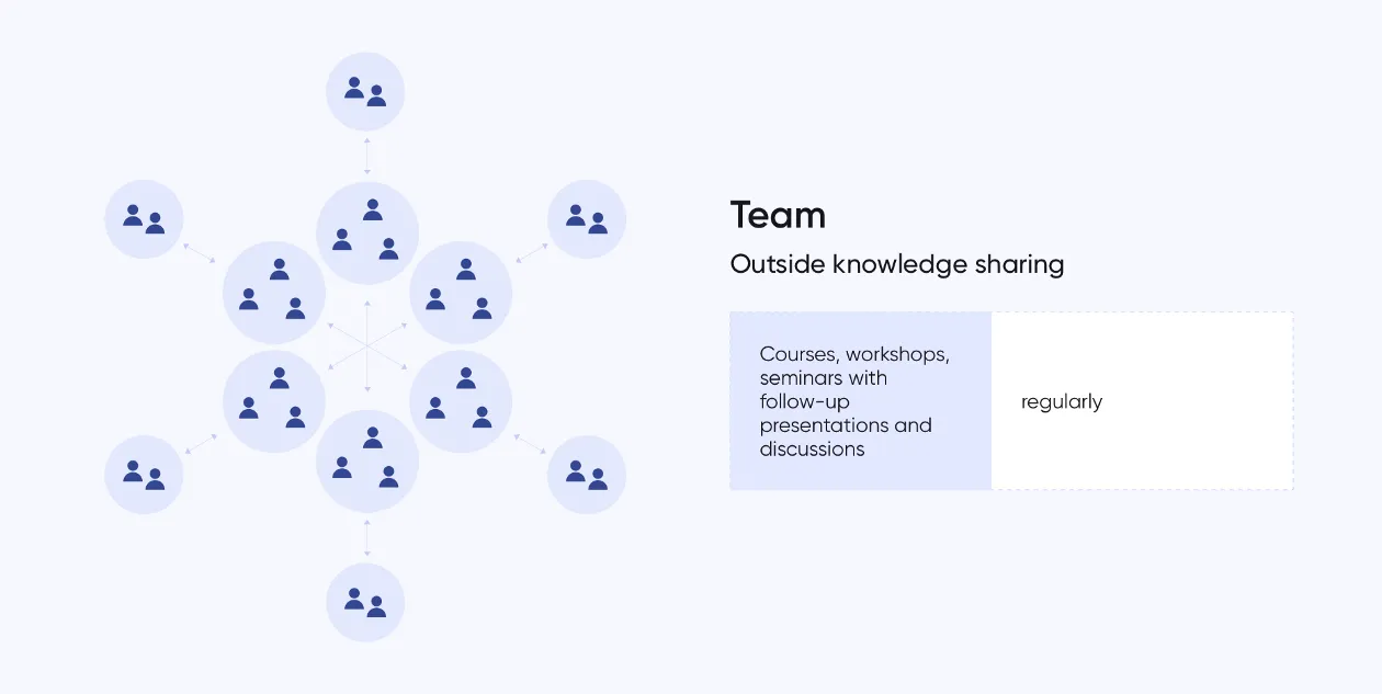 Knowledge sharing within departments. Leads supervise knowledge sharing within every department; they are responsible for formulating and distributing tasks, holding meetings and discussions, monitoring the work on projects, and helping team members. The project department has daily standup meetings, where everyone reports on the day’s tasks. Once a week a presentation is held, where team members share their experience and learn to showcase and analyze their projects. People share their solutions and learn how to present their projects properly (UI, UX). We also have weekly one-to-one meetings, where every team member describes their week and the challenges they’ve had. Brainstorming sessions are held as needed.