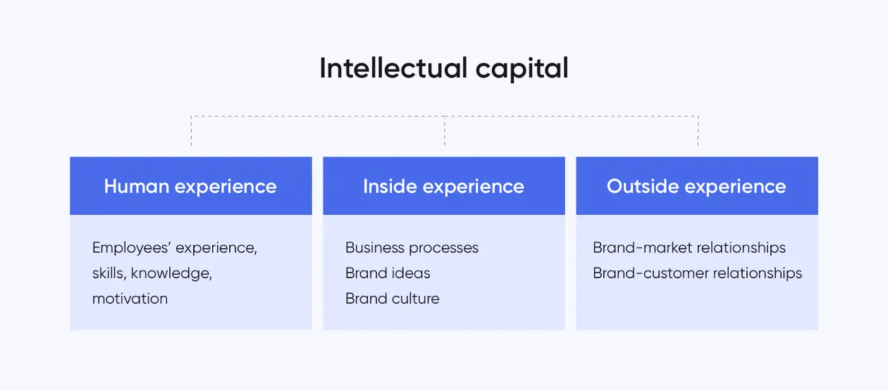 Intellectual capital is more than just the employees’ experience and skills. It’s also their loyalty, motivation, and teamwork. It’s the company’s organizational capital, established business processes, and outside relationships (between the brand and its customers, between the brand and the market). All the ingredients of intellectual capital are interconnected. Communication and knowledge sharing are crucial for efficient utilization of intellectual capital. Here’s our “whole elephant”: