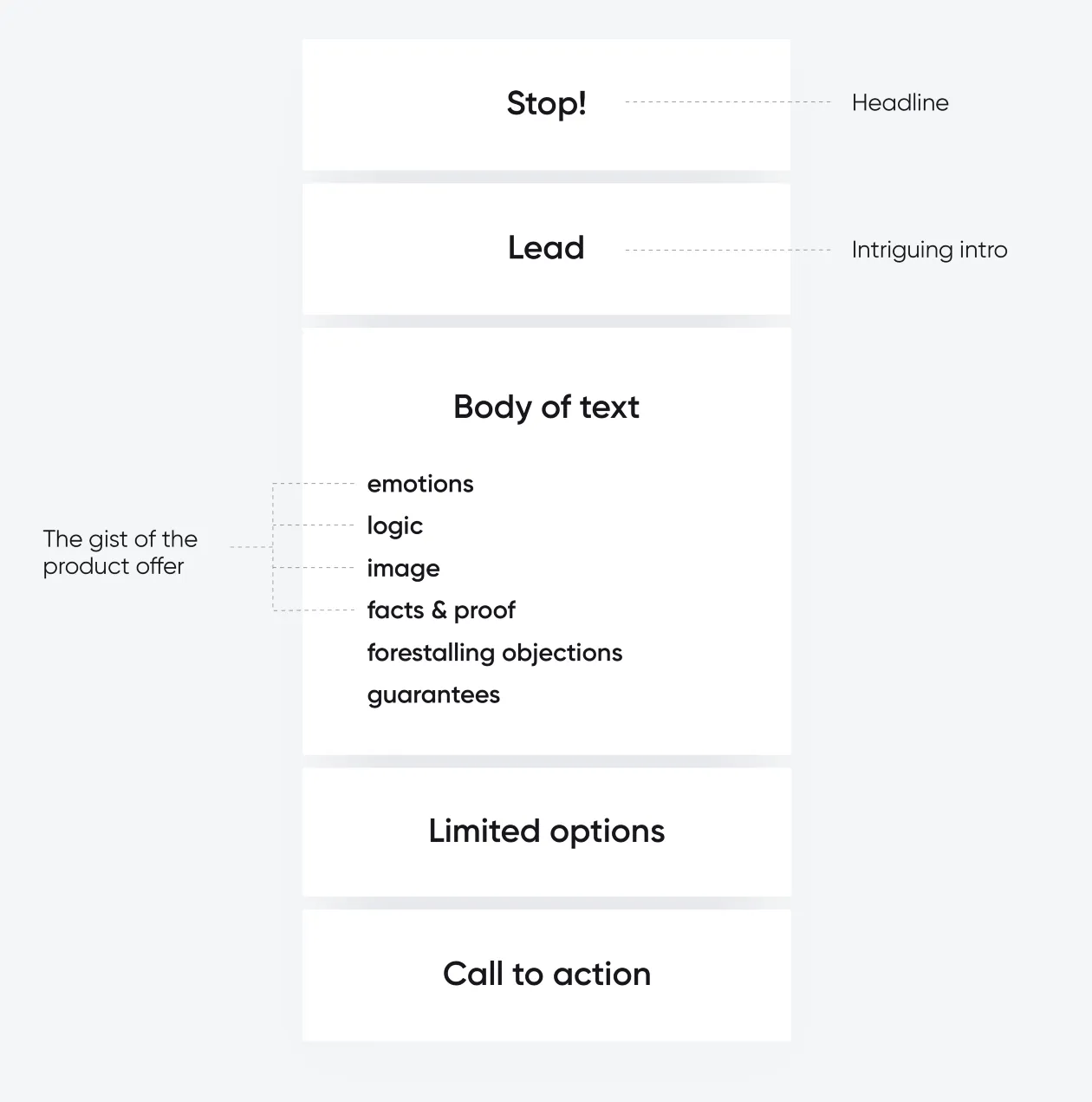 Still, we do have to start with schemes and guidelines. This will help you understand which paragraph contains the information that makes sure your text sells. So let’s have some theory, but not too much: we don’t want to bore you.